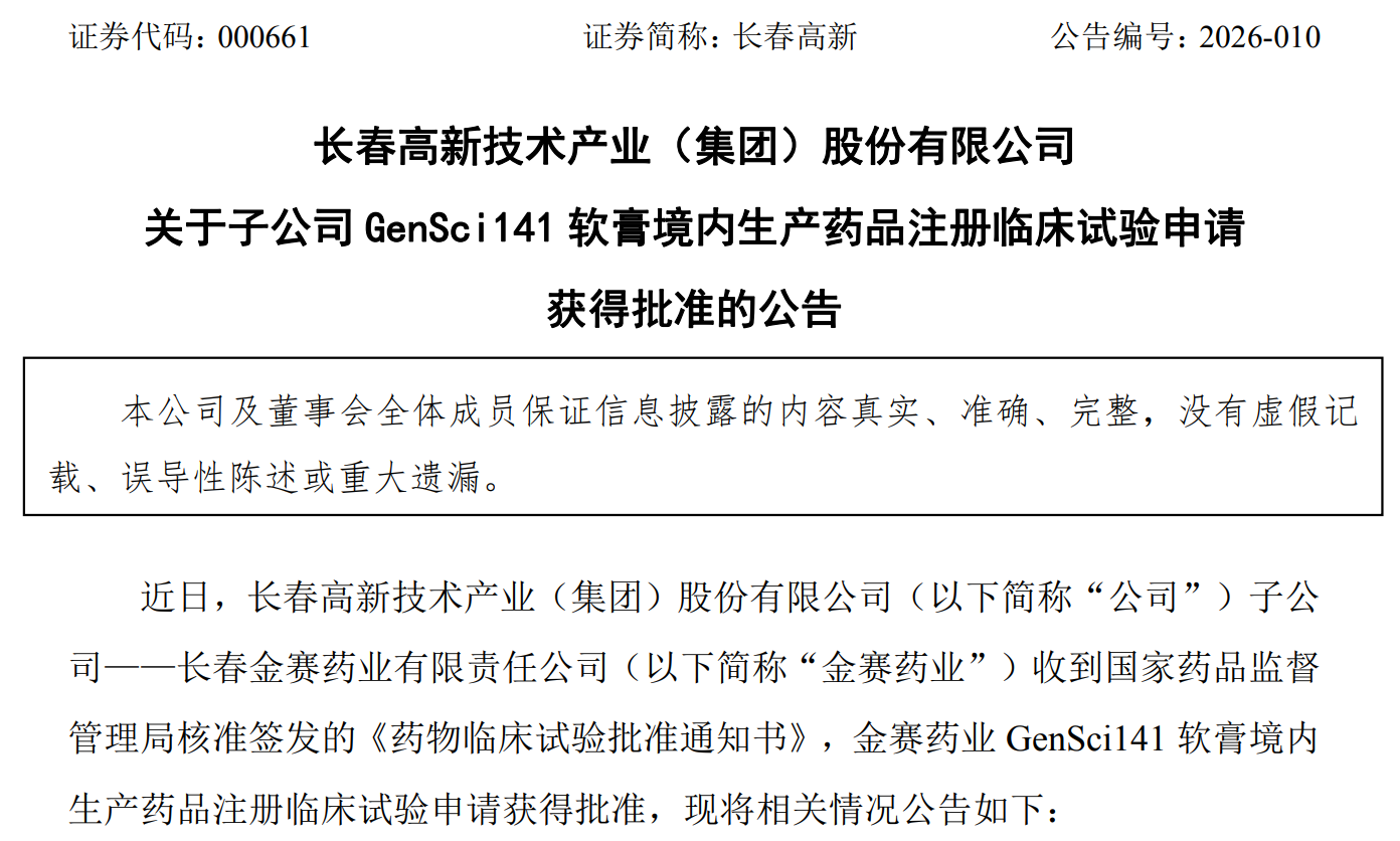 2月24日晚间,长春高新(000661.SZ) 发布公告称,旗下核心子公司金赛药业自主研发的GenSci141软膏(双氢睾酮软膏) 正式获得国家药监局临床试验批准通知书,受理号为CXHL2501394,CXHL2501395,CXHL2501396,CXHL2501397。