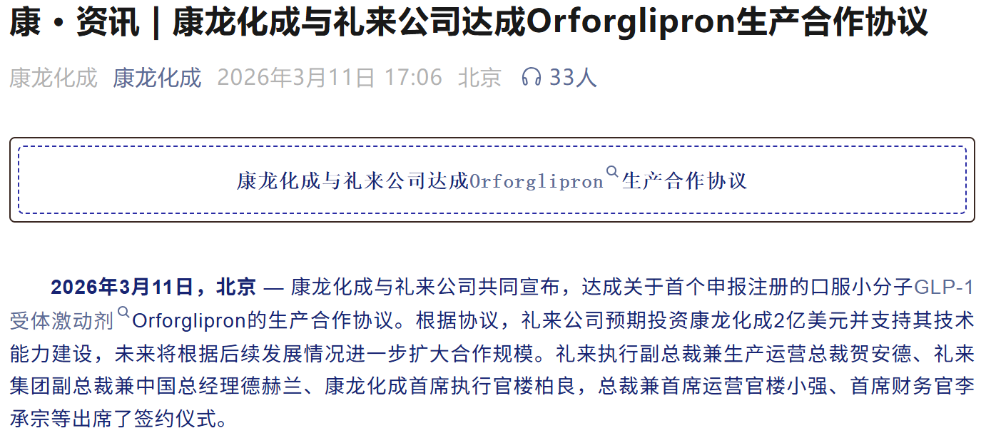 3月11日晚间,康龙化成官方微信发布消息,康龙化成与礼来公司共同宣布,达成关于首个申报注册的口服小分子GLP-1受体激动剂Orforglipron的生产合作协议。