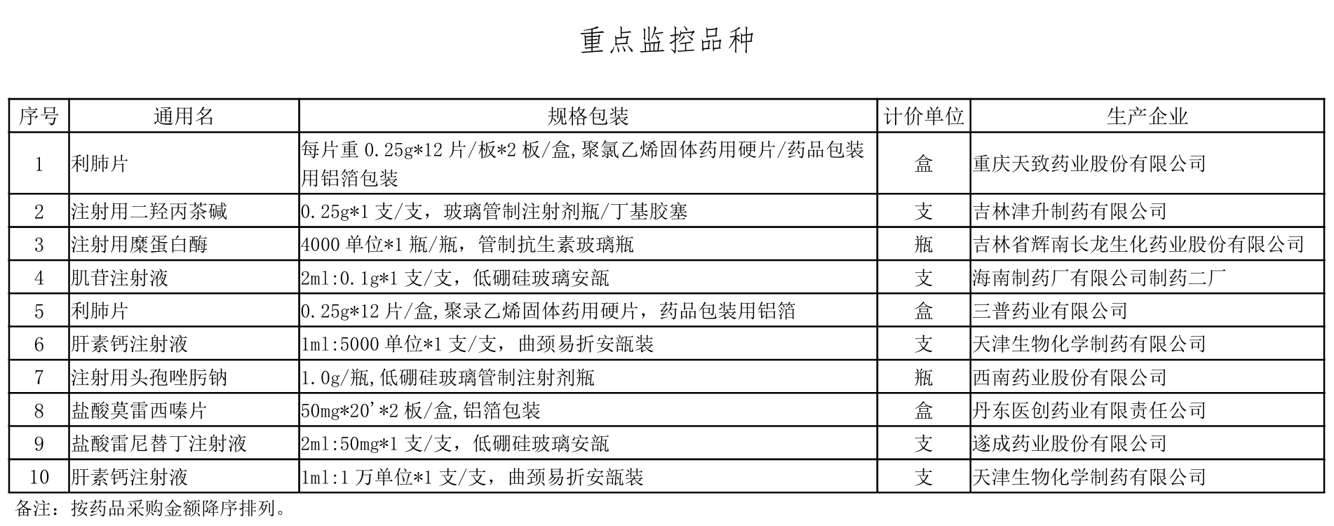 值得注意的是此次纳入的10款药品中,利肺片、注射用二羟丙茶碱、注射用糜蛋白酶、肝素钙注射液此前发布的《2025年8月药品挂网公开议价采购监管品种名单》中已被列为重点监控品种。
