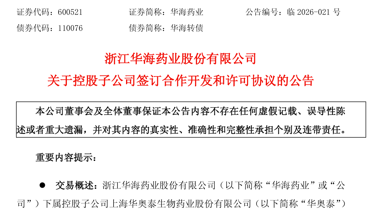 3月29日,华海药业发布公告称,下属控股子公司上海华奥泰生物药业股份有限公司(下称“华奥泰”)与西班牙知名制药企业Almirall,S.A.(下称“ALM”)达成全球研究合作及许可协议,用于开发具有多种潜在适应症(包括医学皮肤科)的新靶点的单克隆抗体候选药物。