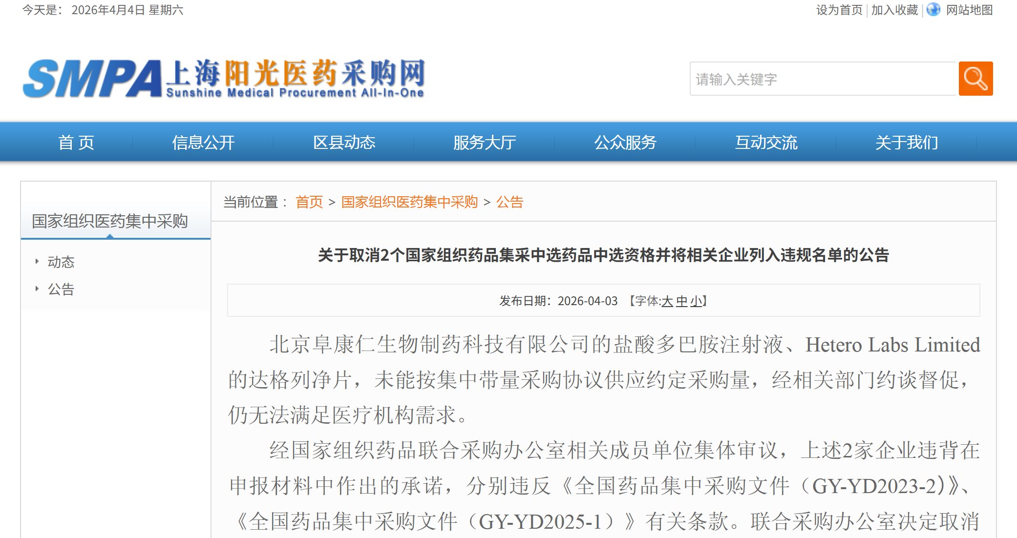 公告显示,北京阜康仁生物制药科技有限公司的盐酸多巴胺注射液、Hetero Labs Limited的达格列净片,未能按集中带量采购协议供应约定采购量,经相关部门约谈督促,仍无法满足医疗机构需求。经国家组织药品联合采购办公室相关成员单位集体审议,上述2家企业违背在申报材料中作出的承诺,分别违反《全国药品集中采购文件(GY-YD2023-2)》、《全国药品集中采购文件(GY-YD2025-1)》有关条款。联合采购办公室决定取消北京阜康仁生物制药科技有限公司的盐酸多巴胺注射液、Hetero Labs Limited的达格列净片中选资格,同时将2家企业列入“违规名单”,取消自2026年4月3日至2030年4月2日共计4年参与国家组织药品集中采购活动的申报资格。