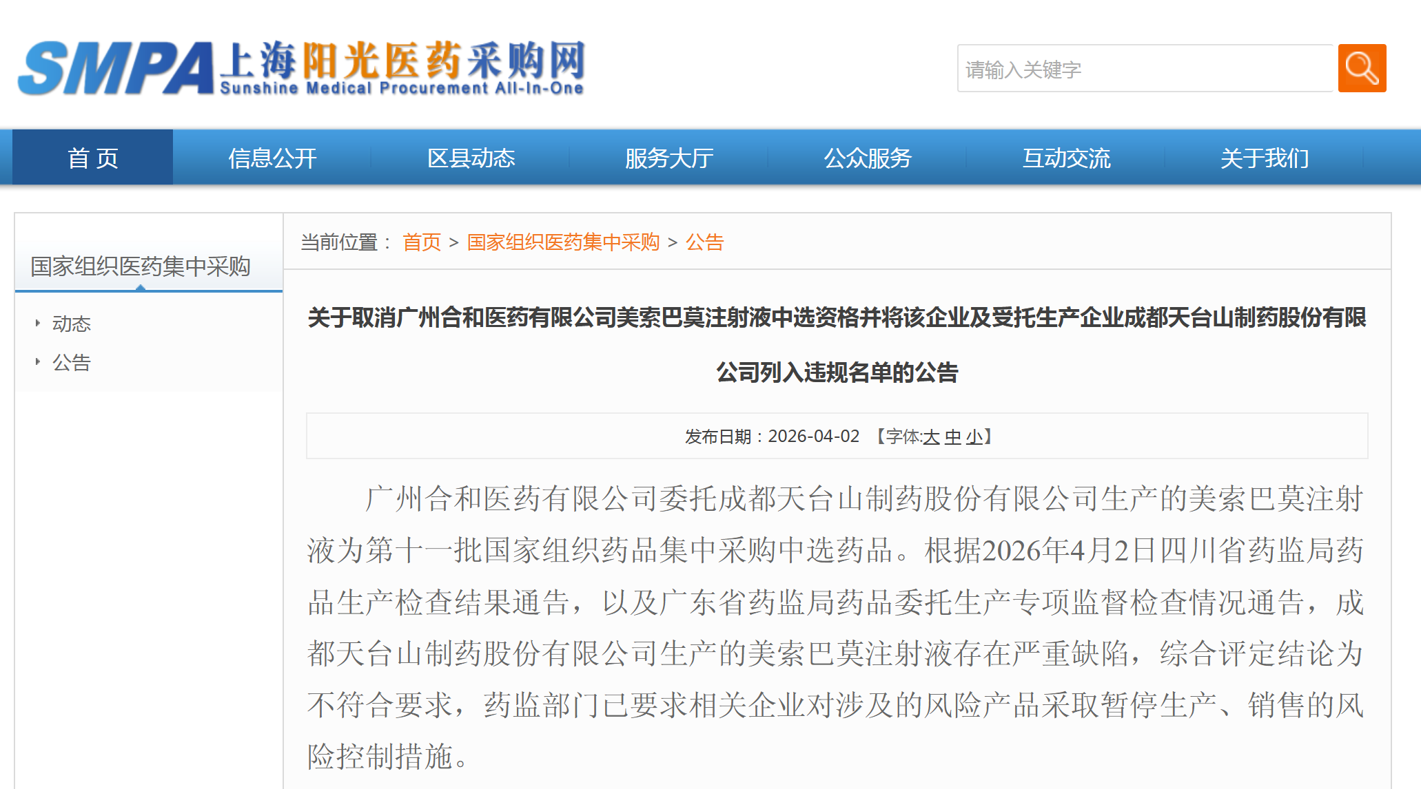 公告显示,广州合和医药有限公司委托成都天台山制药股份有限公司生产的美索巴莫注射液为第十一批国家组织药品集中采购中选药品。根据2026年4月2日四川省药监局药品生产检查结果通告,以及广东省药监局药品委托生产专项监督检查情况通告,成都天台山制药股份有限公司生产的美索巴莫注射液存在严重缺陷,综合评定结论为不符合要求,药监部门已要求相关企业对涉及的风险产品采取暂停生产、销售的风险控制措施。