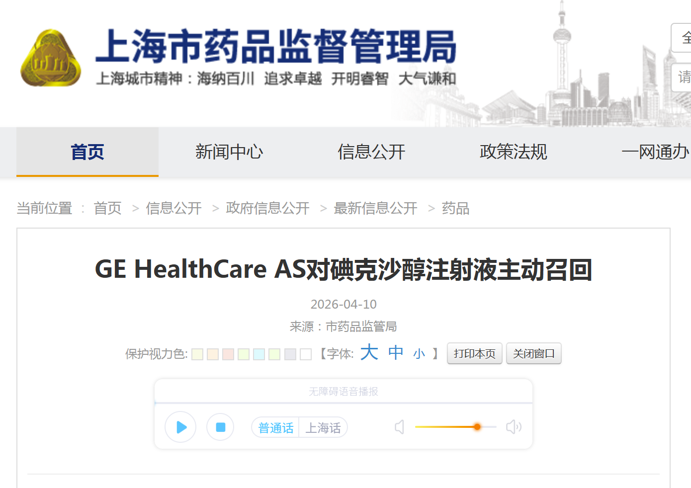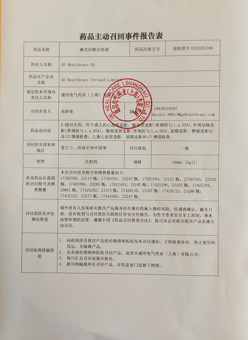 近日,上海药监局发布消息,GE医疗药业主动召回碘克沙醇注射液。召回原因为境外持有人发现相关批次产品瓶身存在潜在的嵌入微粒风险。上海市药监局网站显示,该企业同时表示经调查确认,截至目前,没有收到与召回原因关联的任何安全性报告,但为坚守患者安全至上原则,秉承高度审慎的态度,遵循中国《药品召回管理办法》,决定对相关批次产品实施主动召回。