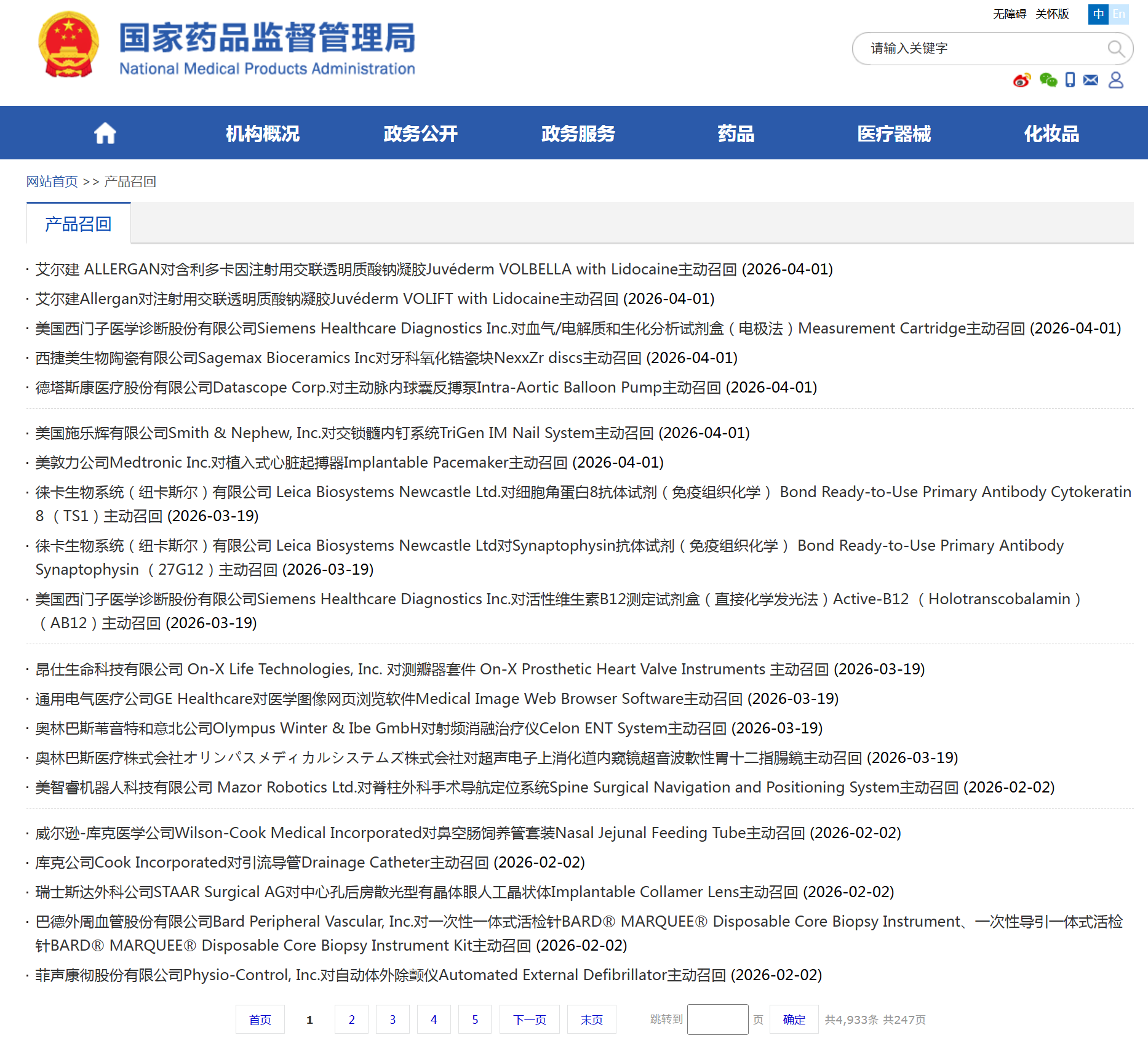 根据国家药监局产品召回栏目显示,2026年开年以来,截至2026年4月1日,涉及主动召回的事件为26起,包括徕卡生物、美敦力、施乐辉、艾尔建等多家全球知名企业。