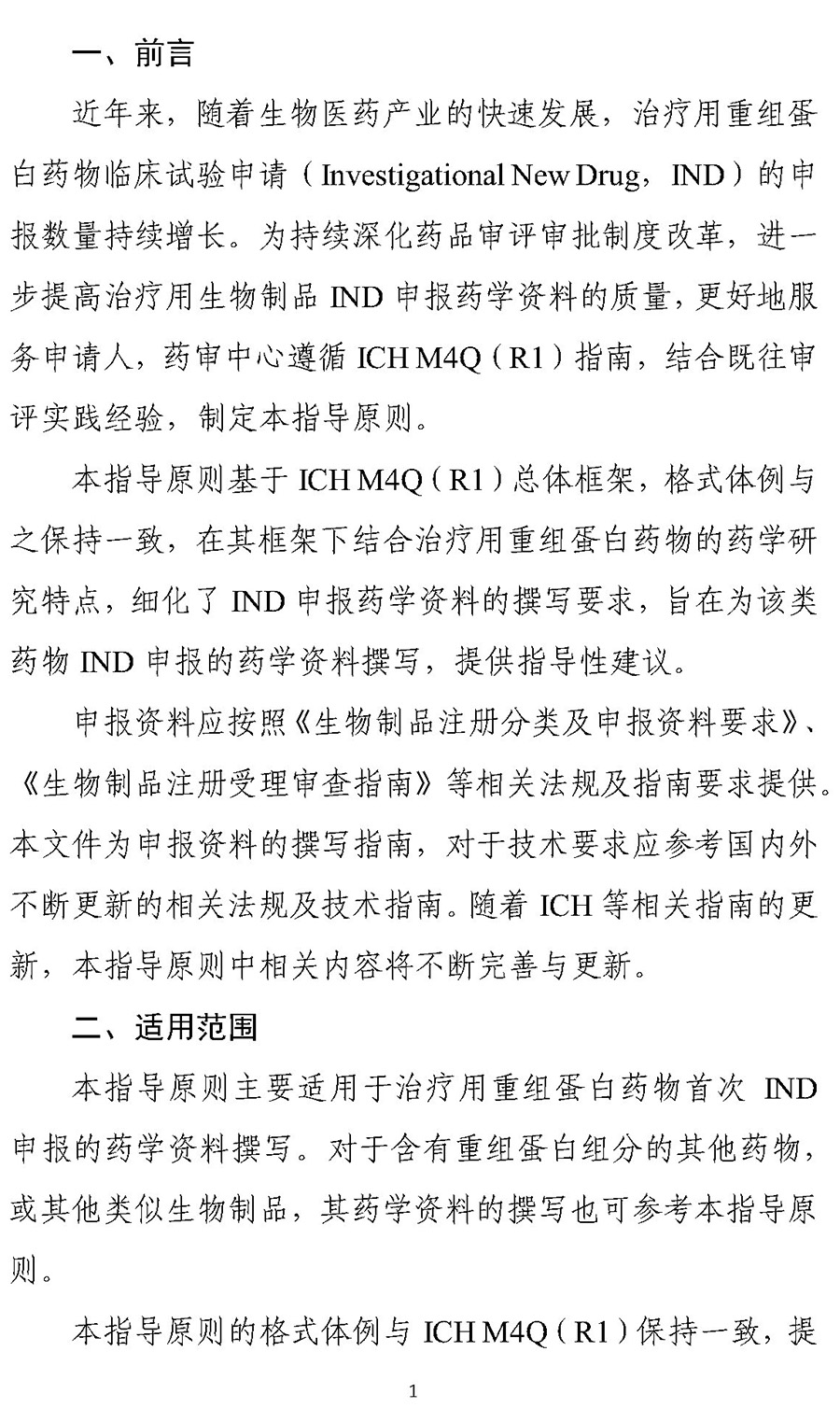 本指导原则基于 ICH M4Q( R1)总体框架, 格式体例与之保持一致, 在其框架下结合治疗用重组蛋白药物的药学研究特点,细化了 IND 申报药学资料的撰写要求,旨在为该类药...