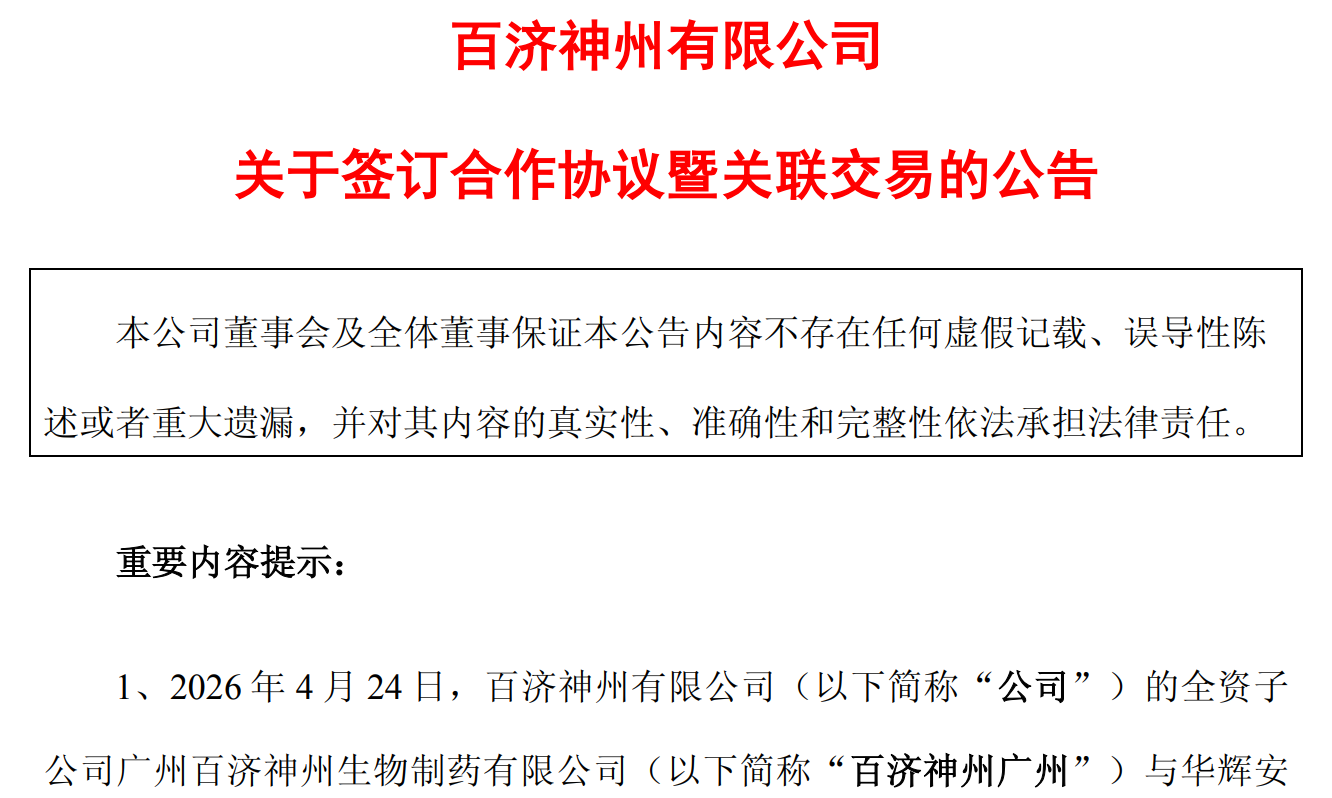 4月28日,百济神州发布公告称,2026年4 月 24 日,百济神州有限公司的全资子公司广州百济神州生物制药有限公司与华辉安健(北京)生物科技有限公司签订了一份《独家选择权、...